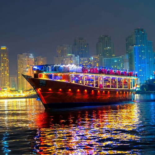 Experience Dubai's vibrant nightlife and stunning skyline with a scenic Marina Cruise, complete with welcome drinks, buffet dinner, and live entertainment, perfect for you and your gang to unwind together.