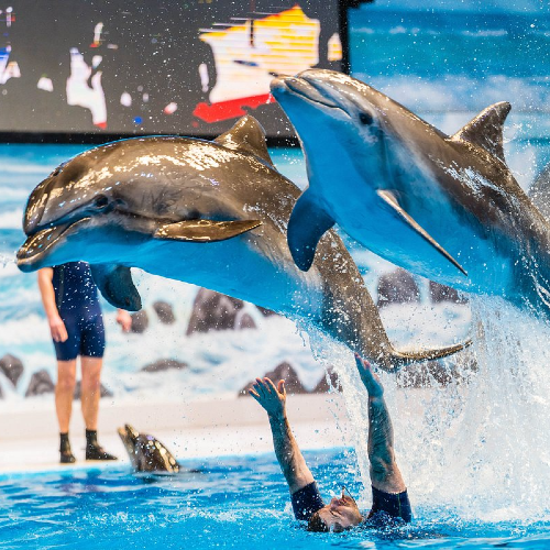 Delve into the world of marine wonders at the Dubai Dolphinarium, where an engaging dolphin and seal show awaits, promising an entertaining experience for all ages, with the added convenience of return private transfers.
